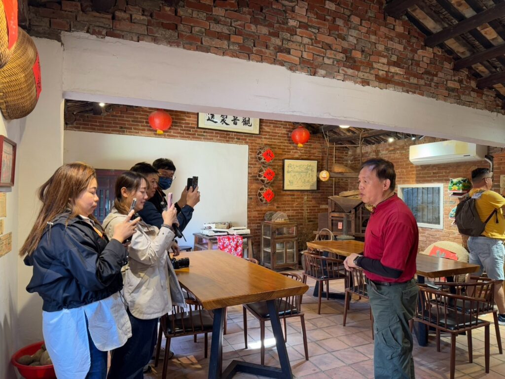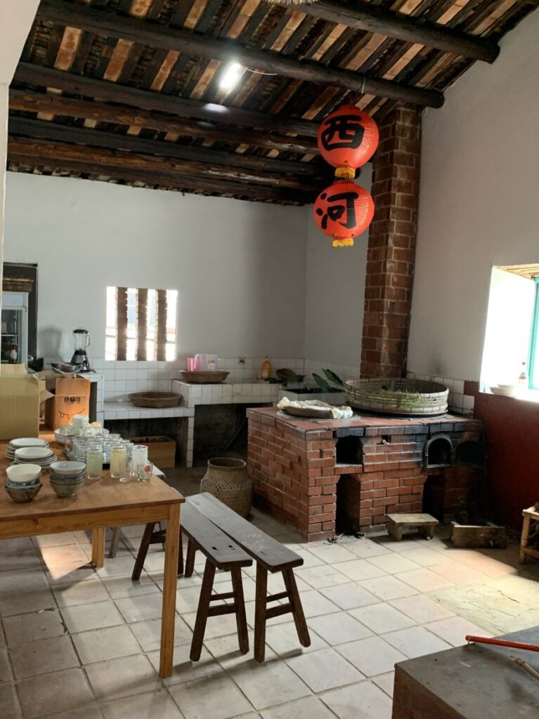 林先生帶我們參觀古厝內部。推開厚重的木門,步入庭院,左側還可以看到保存完好的傳統爐灶,磚砌的爐台上還放著老式鋁壺;右側擺著幾組藤製休閒桌椅,百年三合院古厝, 紅磚黑瓦的傳統建築,充滿懷舊氛圍,適合拍照打卡!