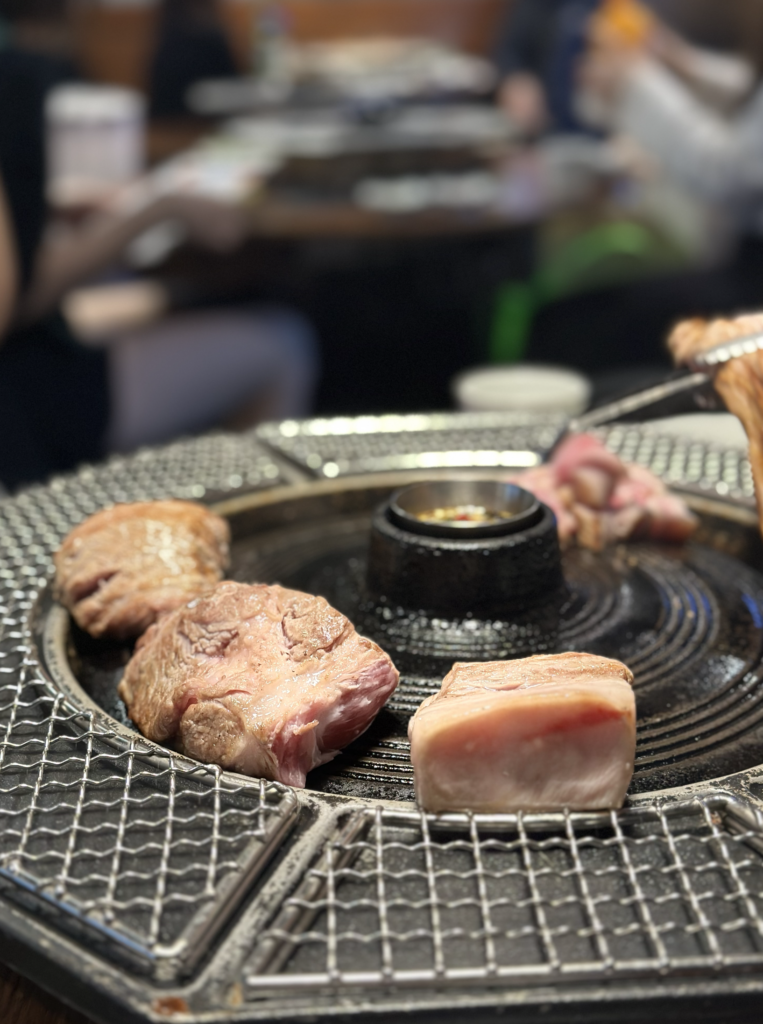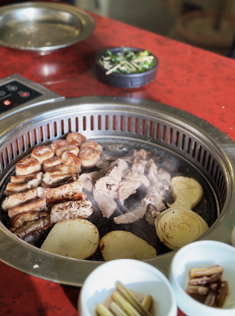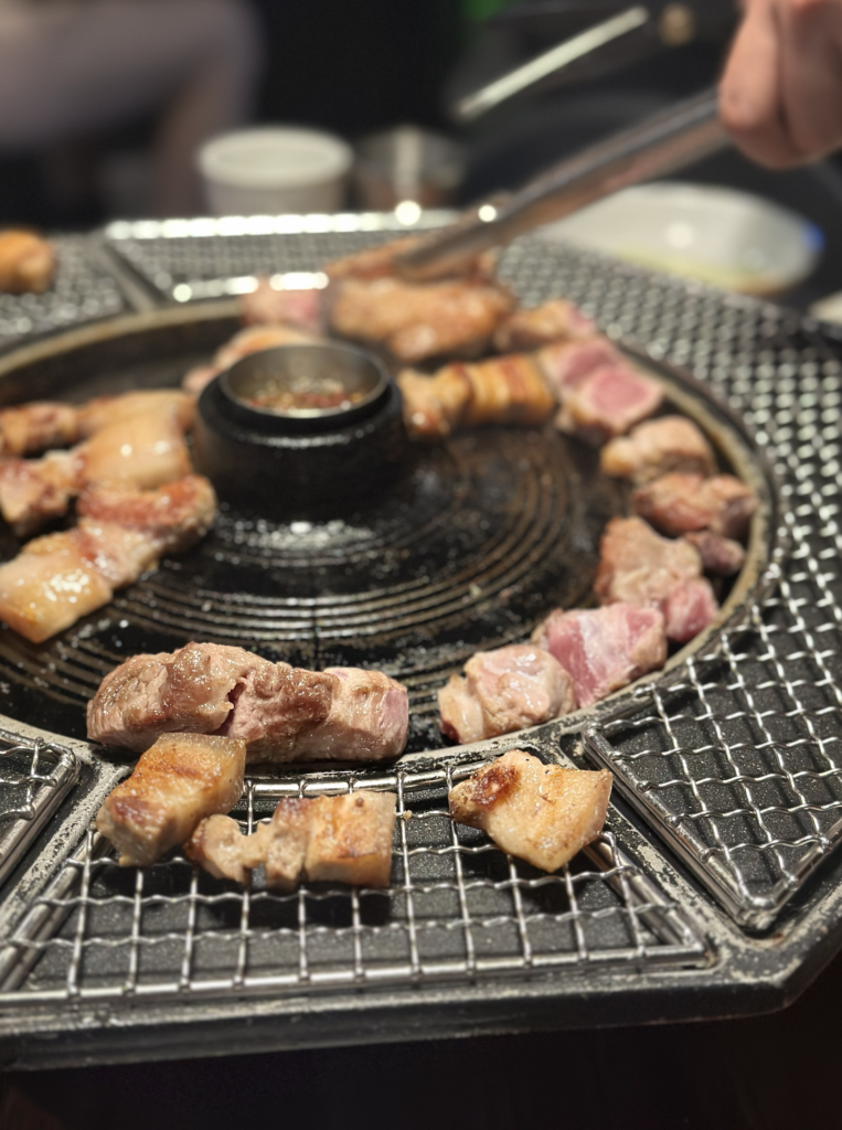 這家名為「돈주는남자(給豚的男人)」的燒肉店,主打每日從濟州島直送的新鮮黑豬肉,肉質鮮度完全不用擔心。老闆會先在大廳中央的爐台上將肉烤至微焦,再端到桌邊由店員繼續代烤,整個過程專業又充滿儀式感,讓人食慾大開。肥瘦相間的黑豬肉烤到外層微焦、香氣撲鼻,搭配烤泡菜與店家特製的獨家蘸料,真的好吃到爆炸!